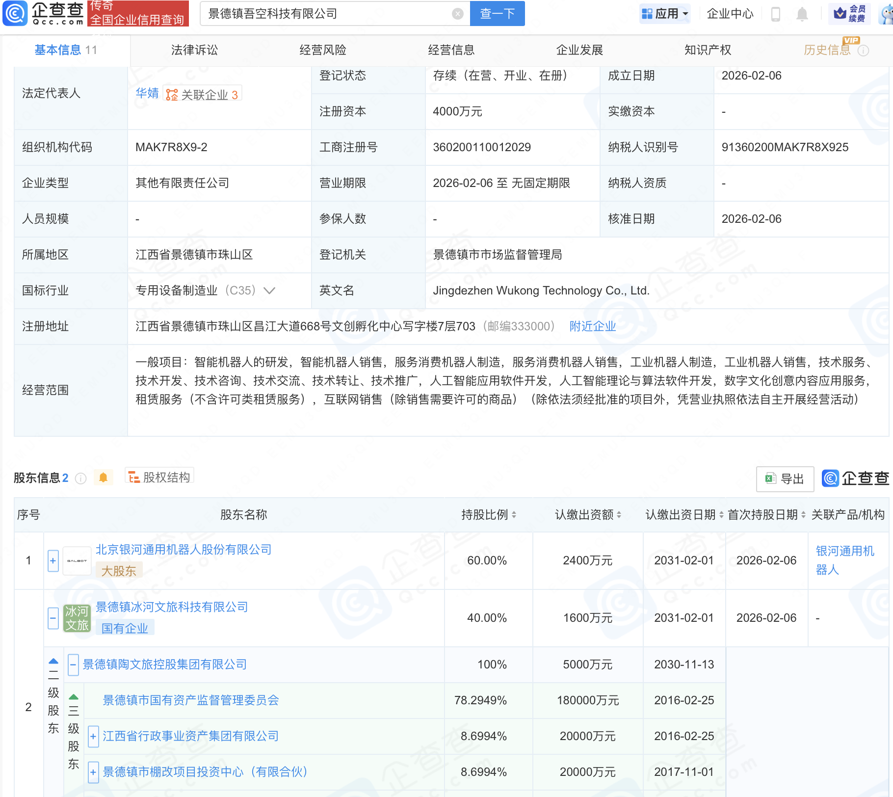近日,景德镇吾空科技有限公司成立,注册资本4000万元,经营范围包含:智能机器人的研发,智能机器人销售,服务消费机器人制造,人工智能应用软件开发,人工智能理论与算法软件开发等。企查查股权穿透显示,该公司由北京银河通用机器人股份有限公司、景德镇冰河文旅科技有限公司共同持股。