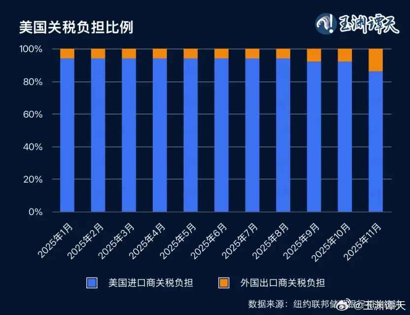 实际上,这些关税主要还是由美国企业和消费者在买单。根据美国纽约联邦储备银行的测算,2025年前11个月,在整体关税水平下,外国出口商负担的最大单月关税比例仅为14%左右,这意味着大部分关税都由美国进口商负担。
